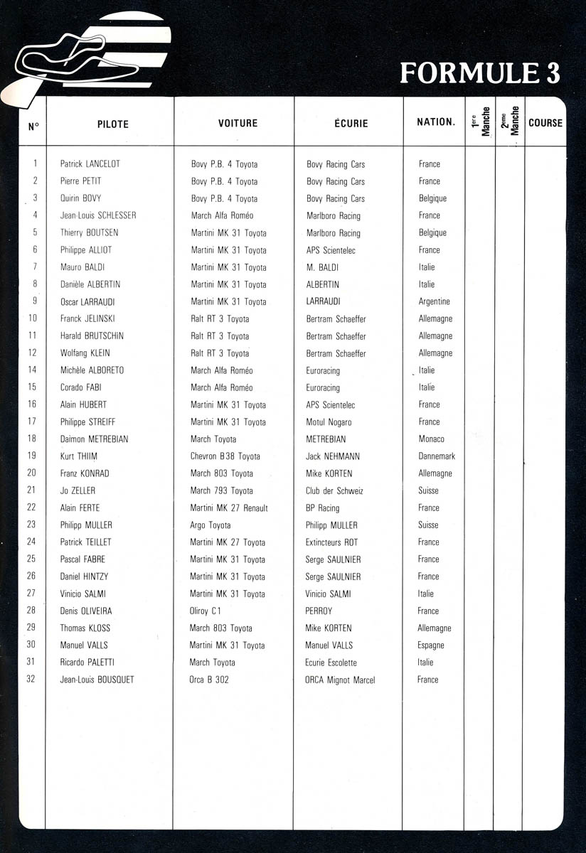 01.06.1980 - La Châtre 6.Lauf FIA European Championship for Formula 3 Streckenskizze Programmheft Starterliste Alle Ergebnisse: Nennungsliste Ergebnis Zeittraining 1 Original Zeitnahme Ergebnis Zeittraining 2 Original Zeitnahme Gesamtergebnis Zeittraining 1+2 Original Zeitnahme Nennungsliste Vorlauf 1 Startaufstellung Vorlauf 1 Original Zeitnahme Ergebnis Vorlauf 1 Original Zeitnahme Nennungsliste Vorlauf 2 Startaufstellung Vorlauf 2 Original Zeitnahme Ergebnis Vorlauf 2 Original Zeitnahme Startaufstellung Finalrennen Original Zeitnahme Ergebnis Finalrennen Original Zeitnahme