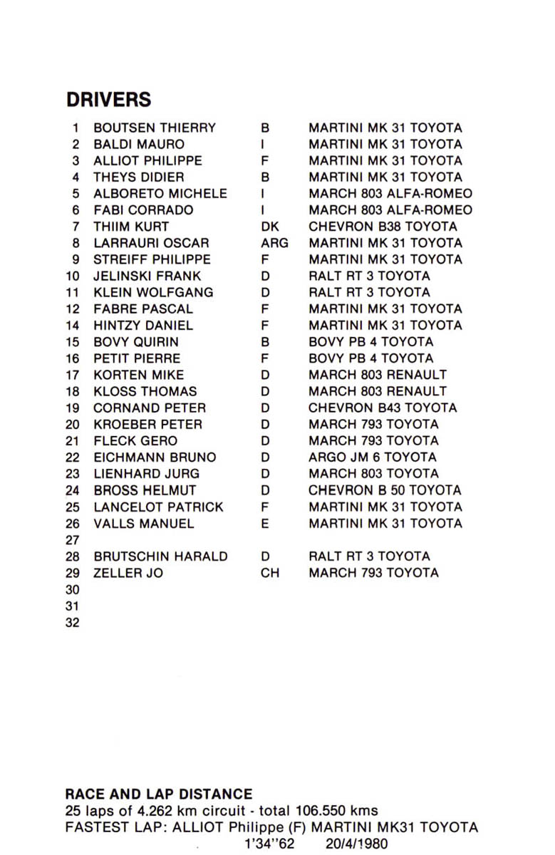 12.10.1980 - Zolder 14.Lauf FIA European Championship for Formula 3 Streckenskizze Programmheft Starterliste Alle Ergebnisse: Nennungsliste Ergebnis Zeittraining 1 Original Zeitnahme Ergebnis Zeittraining 2 Gesamtergebnis Zeittraining 1+2 Original Zeitnahme Startaufstellung Original Zeitnahme Ergebnis Rennen Original Zeitnahme