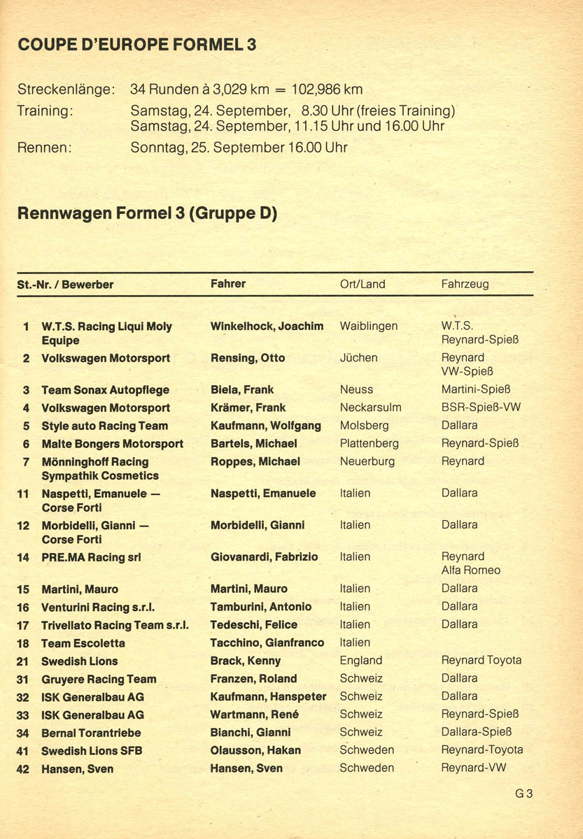 25.09.1988 - Nürburgring FIA Coupe d`Europe Formel 3 Streckenskizze Programmheft Starterliste Alle Ergebnisse: Nennungsliste Ergebnis Zeittraining 1 Original Zeitnahme Ergebnis Zeittraining 2 Gesamtergebnis Zeittraining 1+2 Original Zeitnahme Startaufstellung Ergebnis Rennen Teil 1 Original Zeitnahme Ergebnis Rennen Teil 2 Original Zeitnahme Ergebnis Rennen Teil 1+2 Original Zeitnahme