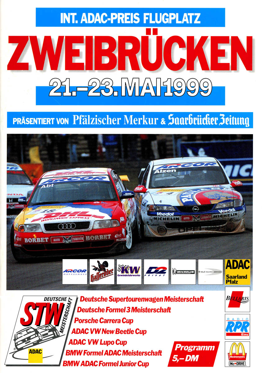 23.05.1999 - Zweibrücken 3.+4.Lauf Deutsche Formel-3-Meisterschaft Streckenskizze Programmheft Starterliste Alle Ergebnisse: Nennungsliste Rennen 1 Ergebnis freies Training 1 Ergebnis freies Training 2 Bericht freies Training Ergebnis Zeittraining 1 Original Zeitnahme Bericht Zeittraining Startaufstellung Rennen 1 Ergebnis Rennen 1 Original Zeitnahme Rundentabelle Rennen 1 Bericht Rennen 1 Nennungsliste Rennen 2 Ergebnis Zeittraining 2 Original Zeitnahme Bericht Zeittraining Startaufstellung Rennen 2 Ergebnis Rennen 2 Original Zeitnahme Rundentabelle Rennen 2 Bericht Rennen 2