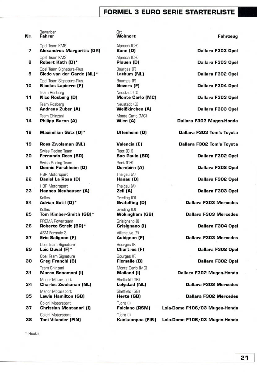 02.05.2004 - Estoril 3.+4.Lauf Formula 3 Euro Series Streckenskizze Programmheft Starterliste Alle Ergebnisse: Vorbericht Nennungsliste Rennen 1 Ergebnis freies Training Bericht freies Training Ergebnis Zeittraining 2 Original Zeitnahme Bericht Zeittraining 2 Startaufstellung Rennen 1 Ergebnis Rennen 1 Original Zeitnahme Rundentabelle Rennen 1 Bericht Rennen 1 Nennungsliste Rennen 2 Ergebnis Zeittraining 1 Original Zeitnahme Bericht Zeittraining 1 Startaufstellung Rennen 2 Ergebnis Rennen 2 Original Zeitnahme Rundentabelle Rennen 2 Bericht Rennen 2