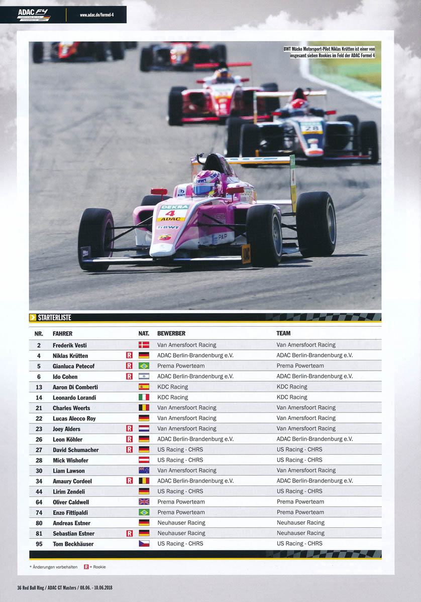 10.06.2018 - Red Bull Ring 10.+11.+12.Lauf ADAC Formel 4 Streckenskizze Programmheft Starterliste Alle Ergebnisse: Vorbericht Ergebnis freies Training 1 Ergebnis freies Training 2 Ergebnis Zeittraining 1 Startaufstellung Rennen 1 Ergebnis Rennen 1 Rundentabelle Rennen 1 Bericht Rennen 1 Ergebnis Zeittraining 2 Startaufstellung Rennen 2 Ergebnis Rennen 2 Rundentabelle Rennen 2 Bericht Rennen 2 Startaufstellung Rennen 3 Ergebnis Rennen 3 Rundentabelle Rennen 3 Bericht Rennen 3