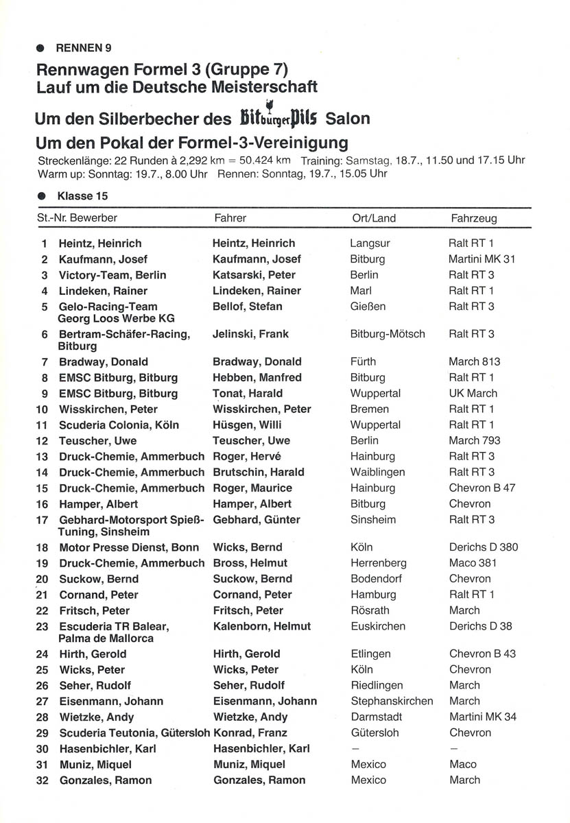 19.07.1981 - Nürburgring 6.Lauf Deutsche Formel-3-Meisterschaft Streckenskizze Programmheft Starterliste Alle Ergebnisse: Nennungsliste Ergebnis Zeittraining 1 Original Zeitnahme Ergebnis Zeittraining 2 Gesamtergebnis Zeittraining 1+2 Original Zeitnahme Startaufstellung Original Zeitnahme Ergebnis Rennen Original Zeitnahme