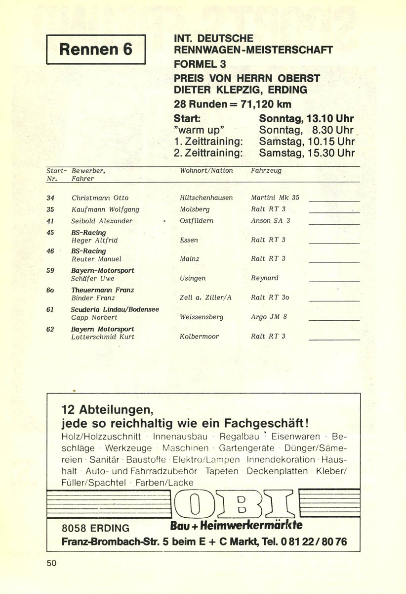 09.06.1985 - Erding 7.Lauf Deutsche Rennwagen-Meisterschaft Formel 3 Streckenskizze Programmheft Starterliste Alle Ergebnisse: Nennungsliste Ergebnis Zeittraining 1 Original Zeitnahme Ergebnis Zeittraining 2 Original Zeitnahme Gesamtergebnis Zeittraining 1+2 Original Zeitnahme Startaufstellung Ergebnis Rennen Original Zeitnahme