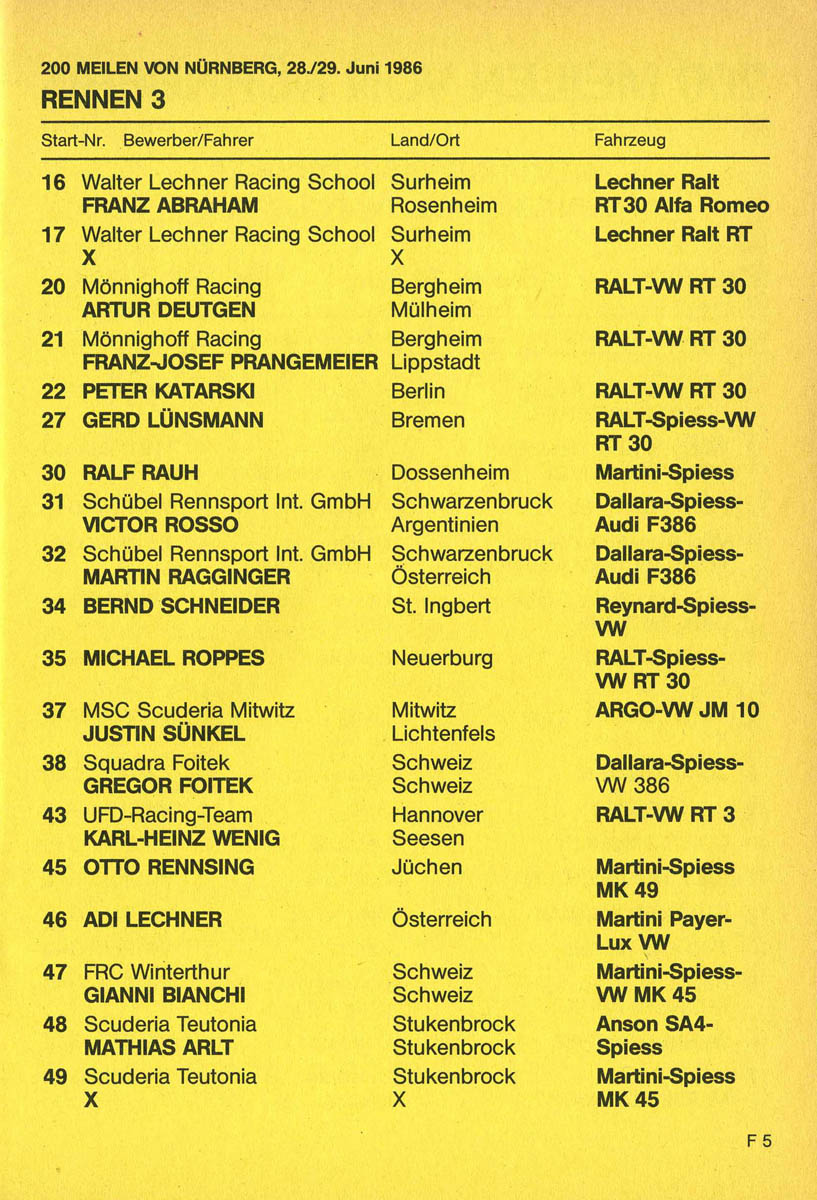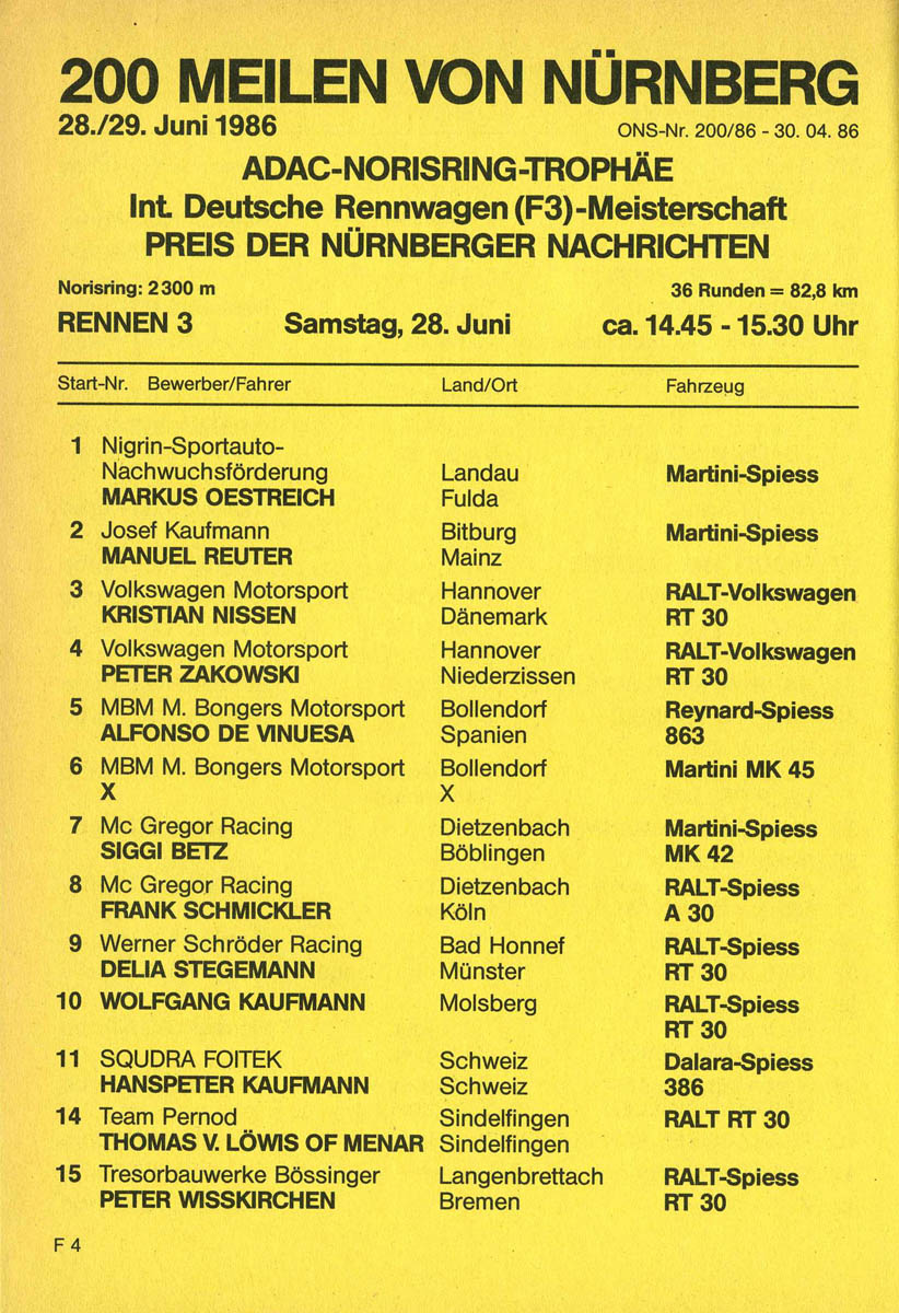 28.06.1986 - Norisring 4.Lauf Deutsche Rennwagen-Meisterschaft Formel 3 Streckenskizze Programmheft Starterliste Alle Ergebnisse: Nennungsliste Ergebnis Zeittraining 1 Original Zeitnahme Ergebnis Zeittraining 2 Gesamtergebnis Zeittraining 1+2 Original Zeitnahme Startaufstellung Ergebnis Rennen Original Zeitnahme Bericht Rennen