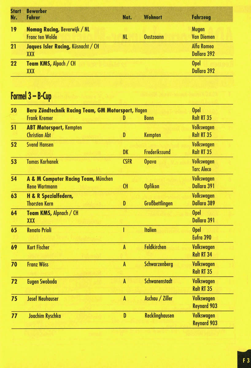 28.06.1992 - Norisring 13.+14.Lauf Deutsche Formel-3-Meisterschaft Streckenskizze Programmheft Starterliste Alle Ergebnisse: Nennungsliste Rennen 1 Ergebnis freies Training Ergebnis Zeittraining 1 Original Zeitnahme Bericht Zeittraining 1 Ergebnis Zeittraining 2 Bericht Zeittraining 2 Gesamtergebnis Zeittraining 1+2 Original Zeitnahme Startaufstellung Rennen 1 Ergebnis Rennen 1 Original Zeitnahme Bericht Rennen 1 Nennungsliste Rennen 2 Startaufstellung Rennen 2 Ergebnis Rennen 2 Original Zeitnahme Bericht Rennen 2