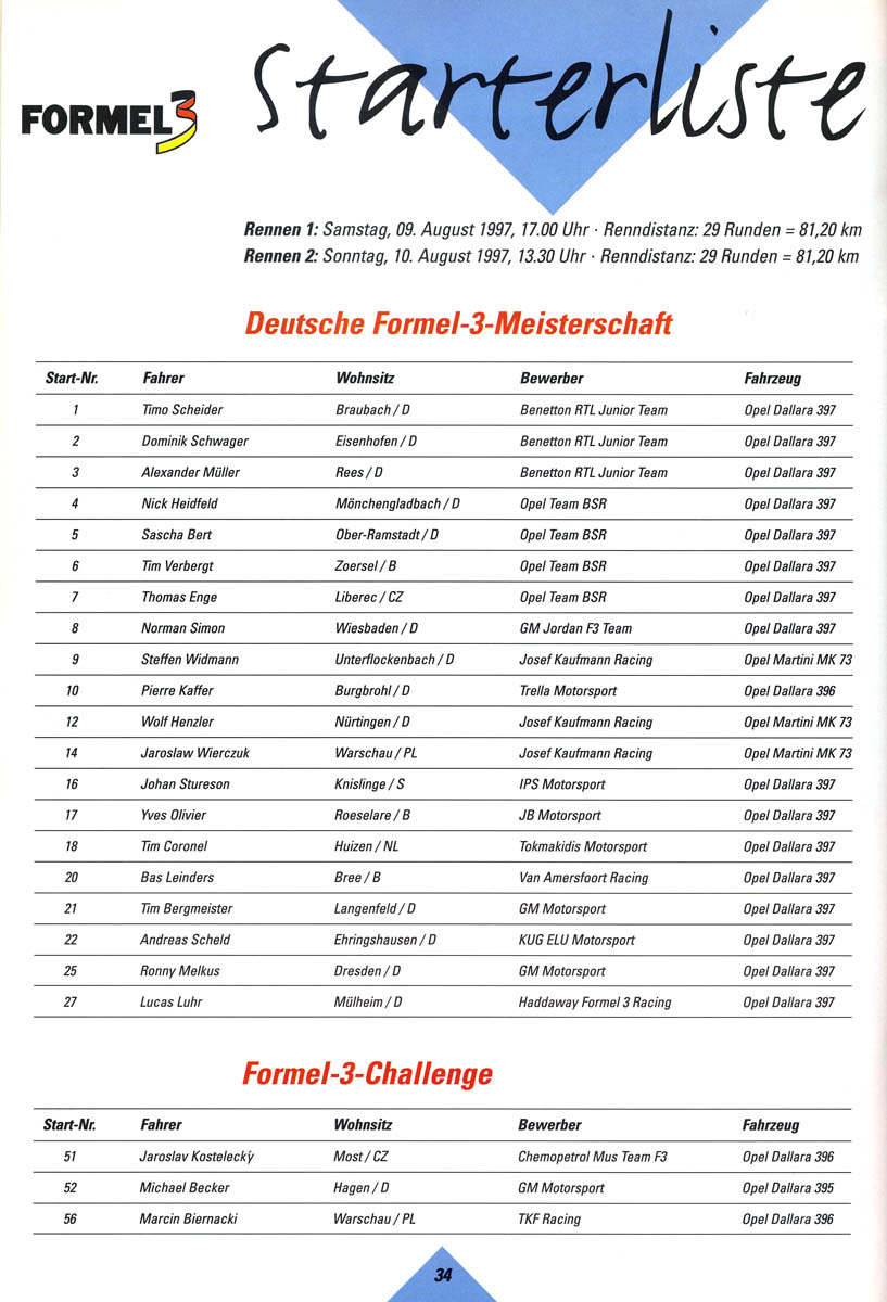 10.08.1997 - Zweibrücken 11.+12.Lauf Deutsche Formel-3-Meisterschaft Streckenskizze Programmheft Starterliste Alle Ergebnisse: Nennungsliste Rennen 1 Ergebnis freies Training Bericht freies Training Ergebnis Zeittraining Original Zeitnahme Bericht Zeittraining Startaufstellung Rennen 1 Ergebnis Rennen 1 Original Zeitnahme Rundentabelle Rennen 1 Bericht Rennen 1 Nennungsliste Rennen 2 Startaufstellung Rennen 2 Ergebnis Rennen 2 Original Zeitnahme Rundentabelle Rennen 2 Bericht Rennen 2